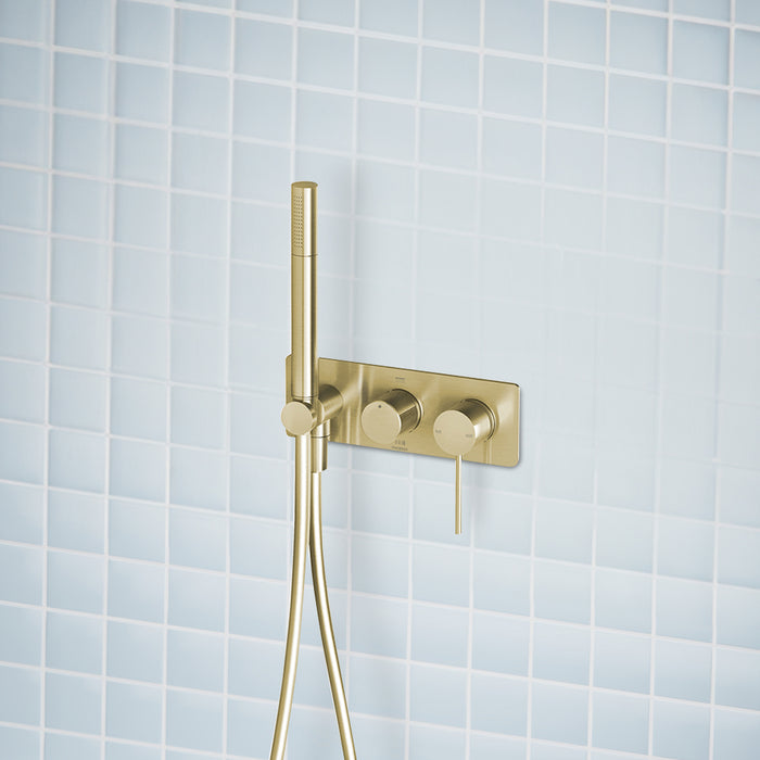 Vivid Slimline Wall Shower System Brushed Gold Ceramic 180° rotary diverter to switch between handpiece and a second connected outlet Single function handpiece with easy-clean hose AS2845.1 Compliant Dual Check... Read more