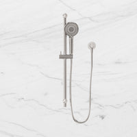 Product Type: Rail ShowerProduct SKU: NR318BNColour: Brushed NickelMaterial: 304 Stainless SteelWELS Rating: 3Star 9.0L/Min Features: High quality solid metal rail 3 function handset Strong and durable, satin-smooth hose Adjustable bottom pillar... Read more