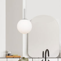 The Bally pendant is the essence of pure and simple lighting design. The sphere is finely blasted opal glass resembling the surface of fresh snow. The rounded shape is continued with the minimal metal gallery. A short metal stem finishes the story of mid-century modernism. Available in 4 sizes and 3 metal finishes.