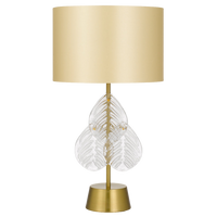 The Melania table lamp is a beautiful and bold addition to your luxury space. The fabric drum shade is supported by a simple antique gold metal stem and base. The stem is adorned by slumped clear glass leaves that shimmer when illuminated from above. The expert crafting of this table lamp is a perfect addition for all modern home furnishings.