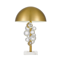 The Narvik Table Lamp has frosted spheres gracing the gold frame almost as if they are suspended in air. The graceful lamp is finished with a domed metal shade adding extra focus to the base which is finished in white marble. Modern and glamorous describe this polished and refined lamp's unique aesthetic. The Narvik lamp is home in a variety of spaces from a chic living room to a modern bedroom.