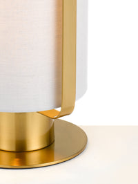 The Orwel table lamp is a sleek balance between urban and retro design. The cotton TC shade is hooped by a solid metal band finished in high polished antique gold. The simple base as an on-trend class to a practical and stylish table lamp. The choice of shade colours opens the lamp up to a variety of décors.