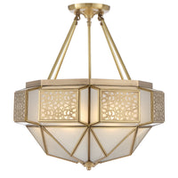 The Overton Artisan Brass Pendant Light is a masterpiece of design and craftsmanship. Its upper tier showcases a stunning lattice pattern crafted from solid brass, elegantly overlaying the acid-frost glass.... Read more