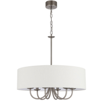 The Shiron Pendant Light is a perfect blend of classic elegance and modern sophistication. Available in both 4-light and 6-light options, this fixture beautifully balances timeless design with contemporary flair. Its sleek frame, offered in either dark nickel or brass, complements the soft, fabric drum shade, creating a warm and inviting ambiance. Designed for versatility, the Shiron comes with a 2-metre chain and is fully height adjustable, allowing you to customise it to suit your space perfectly. Whether you're looking to add a refined touch to your dining area, living space, or entryway, this pendant is a stylish statement piece that brings charm and character to any room.