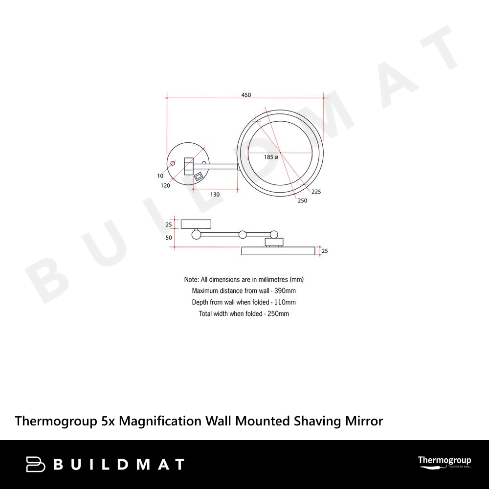 Thermogroup Ablaze 5x Magnification Wall Mounted Shaving Mirror 250mm Chrome with Exposed Wiring