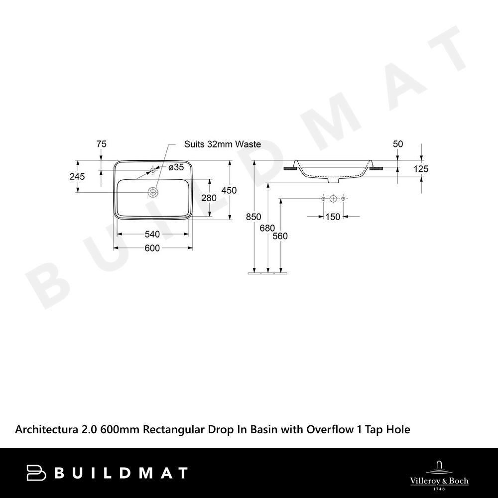 Villeroy & Boch Architectura 2.0 600mm Rectangular Drop In Basin with Overflow 1 Tap Hole Alpine White