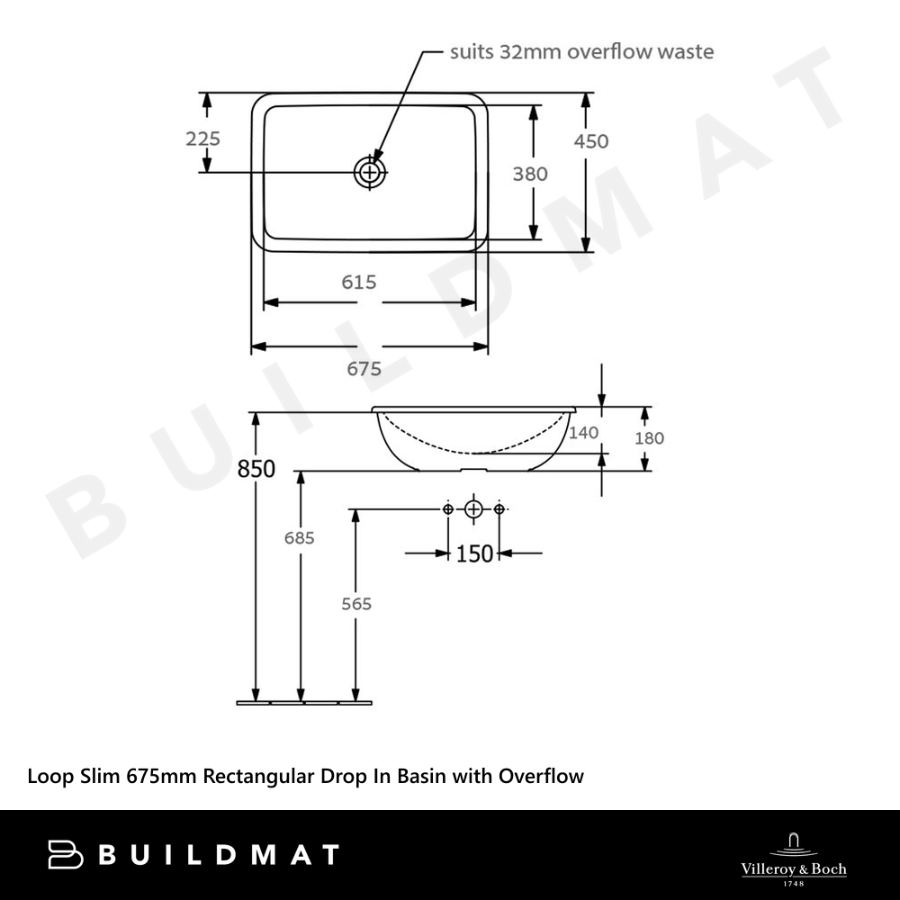 Villeroy & Boch Loop Slim 675mm Rectangular Drop In Basin with Overflow Alpine White