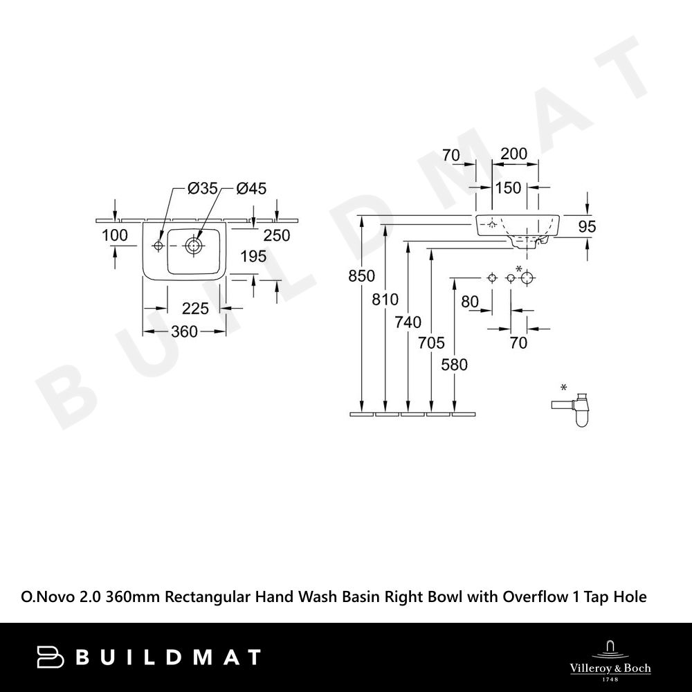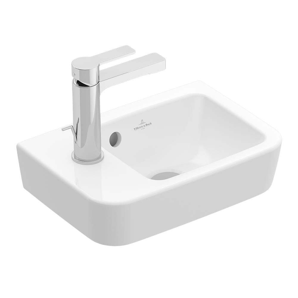 Villeroy & Boch O.Novo 2.0 360mm Rectangular Hand Wash Basin Right Bowl with Overflow 1 Tap Hole Alpine White
