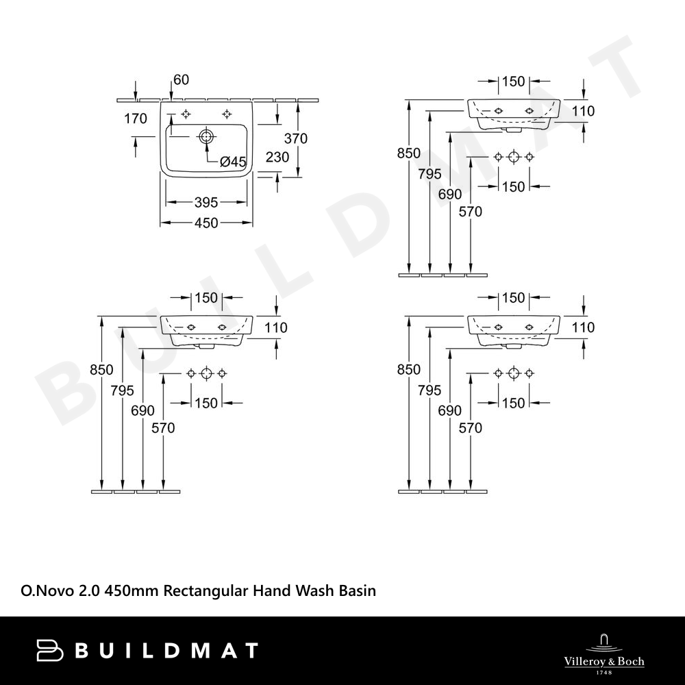 Villeroy & Boch O.Novo 2.0 450mm Rectangular Hand Wash Basin Alpine White