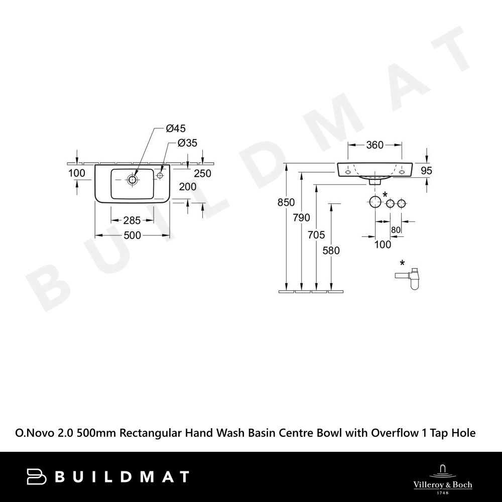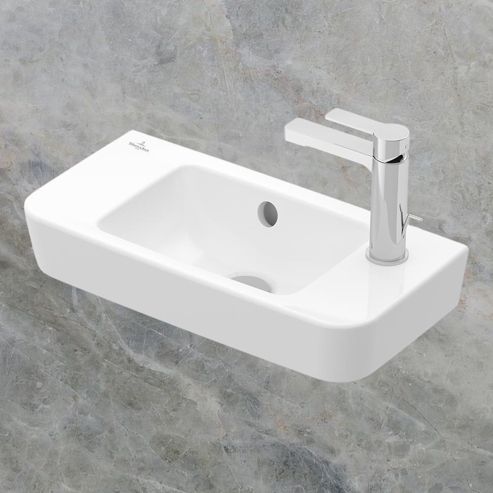 Villeroy & Boch O.Novo 2.0 500mm Rectangular Hand Wash Basin Centre Bowl with Overflow 1 Right Tap Hole Alpine White