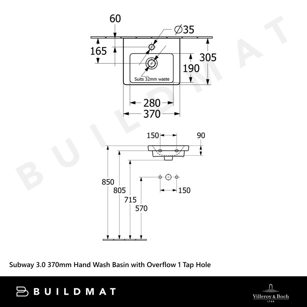 Villeroy & Boch Subway 3.0 370mm Hand Wash Basin with Overflow 1 Tap Hole Alpine White