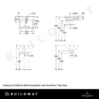 Villeroy & Boch Subway 3.0 500mm Wall Hung Basin with Overflow 1 Tap Hole Stone White