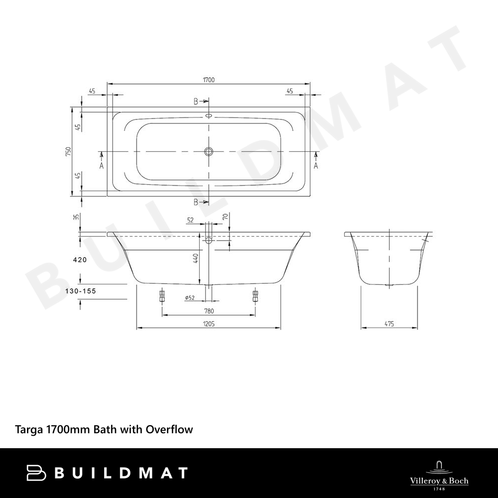 Villeroy & Boch Targa 1700mm Bath with Chrome Overflow White