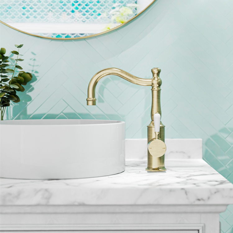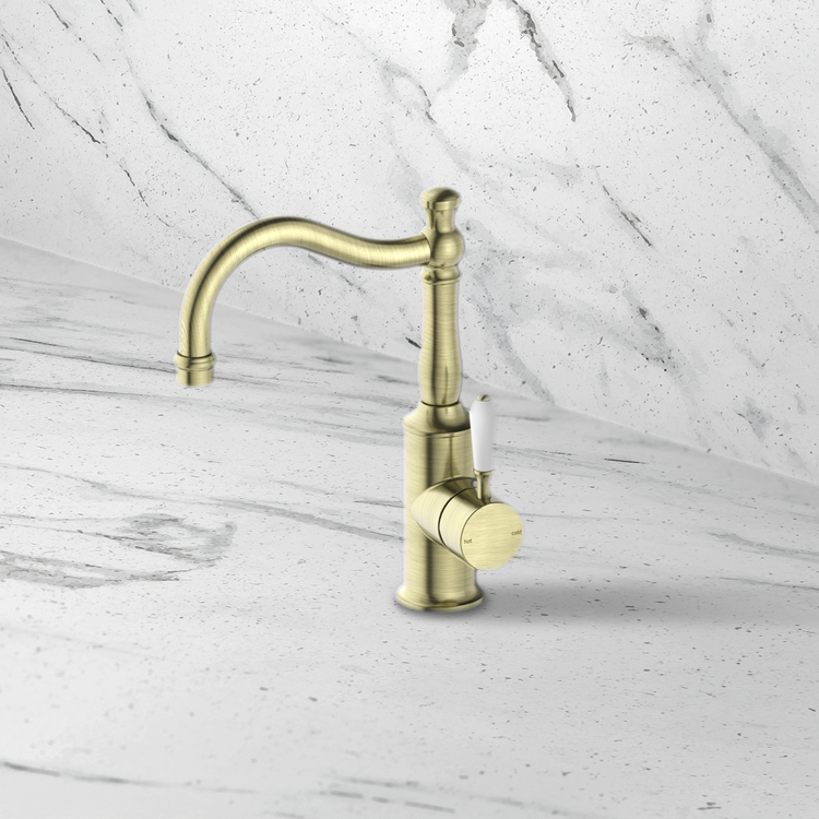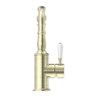 Nero York Basin Mixer Hook Spout with White Porcelain Lever Aged Brass