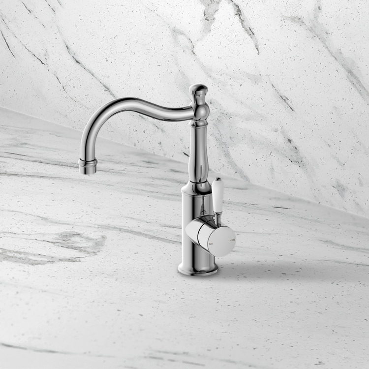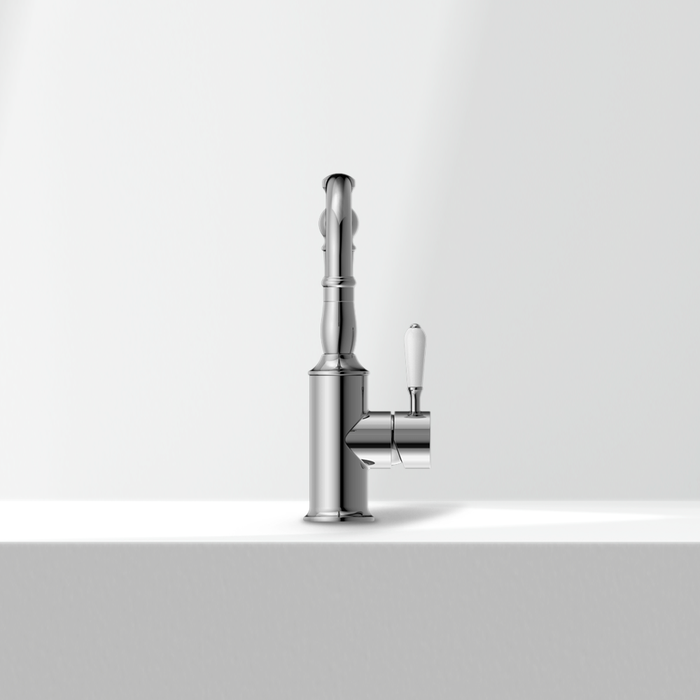 Nero York Basin Mixer Hook Spout with White Porcelain Lever Chrome