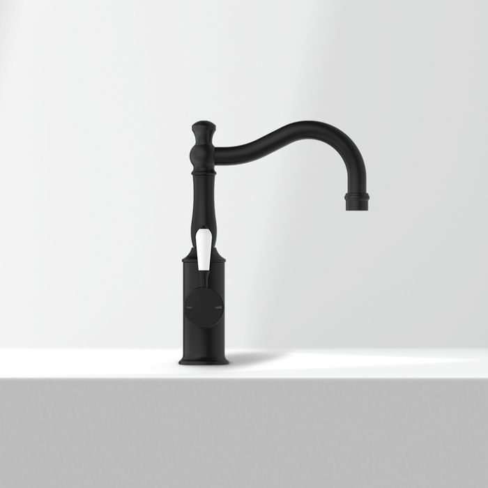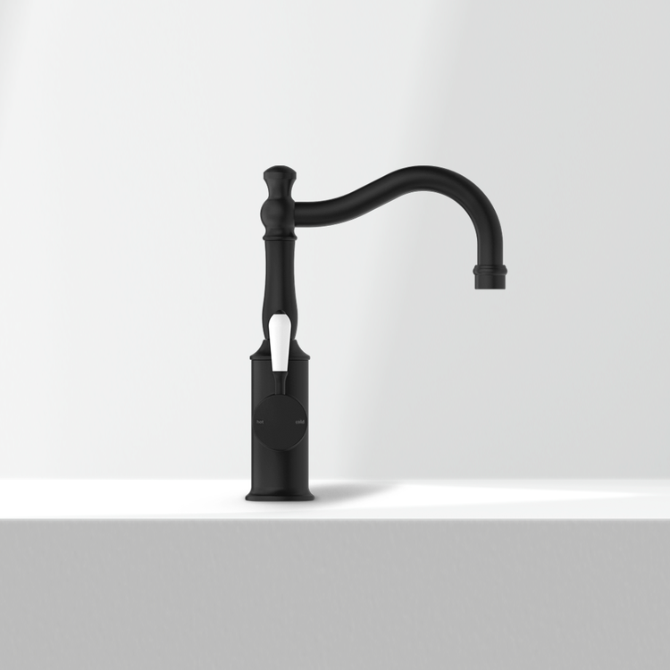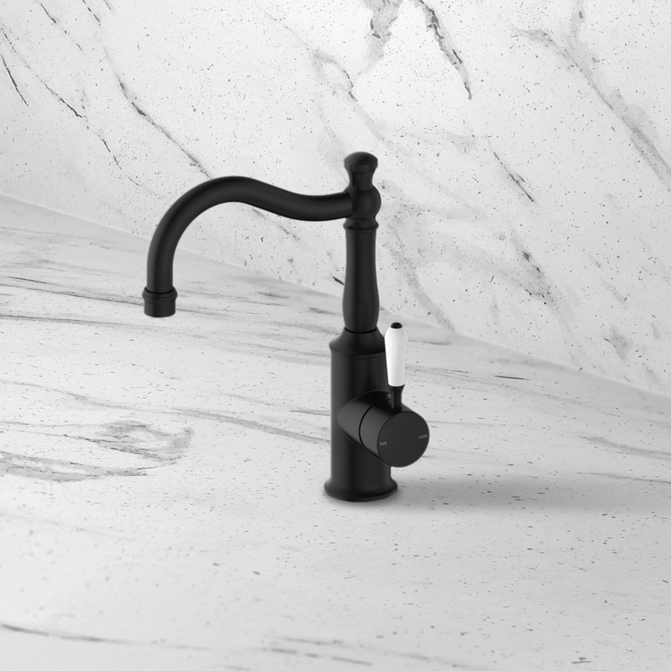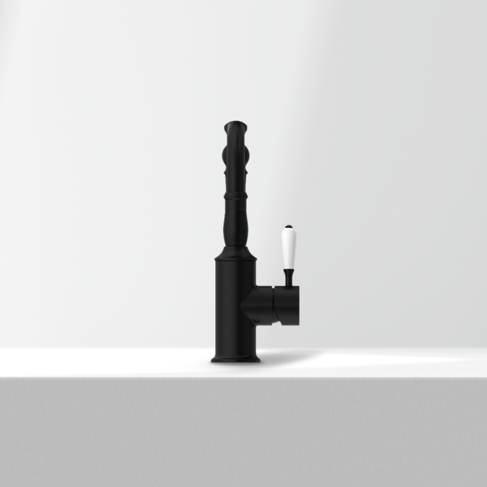 Nero York Basin Mixer Hook Spout with White Porcelain Lever Matte Black