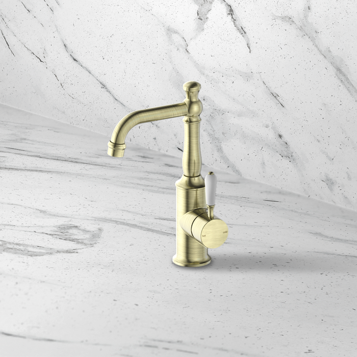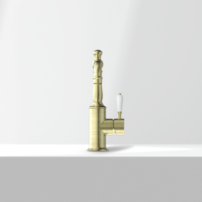 Nero York Basin Mixer with White Porcelain Lever Aged Brass