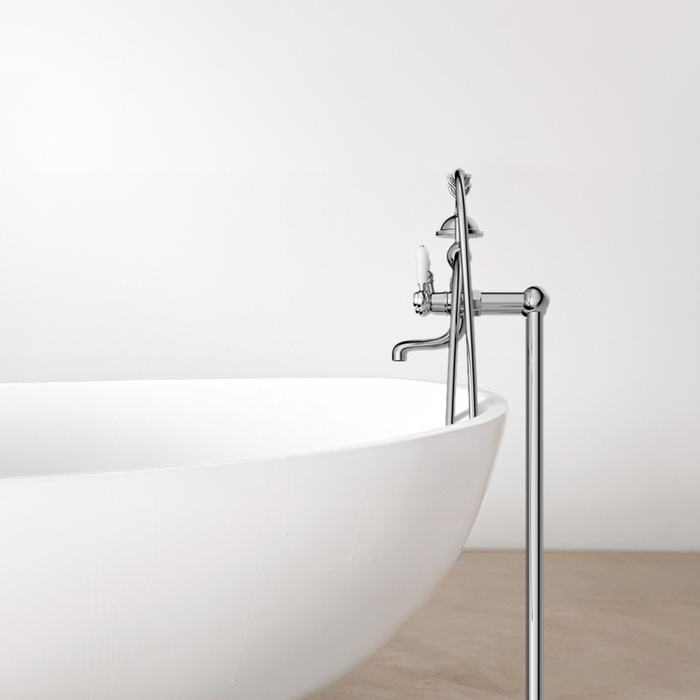 Nero York Freestanding Bath Mixer With White Porcelain Hand Shower Chrome