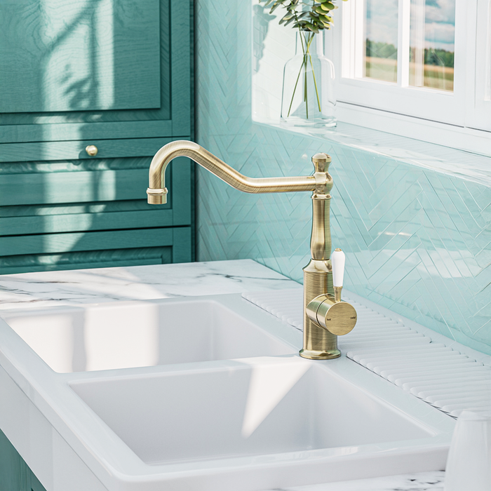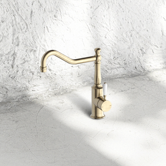 Nero York Kitchen Mixer Hook Spout with White Porcelain Lever Aged Brass