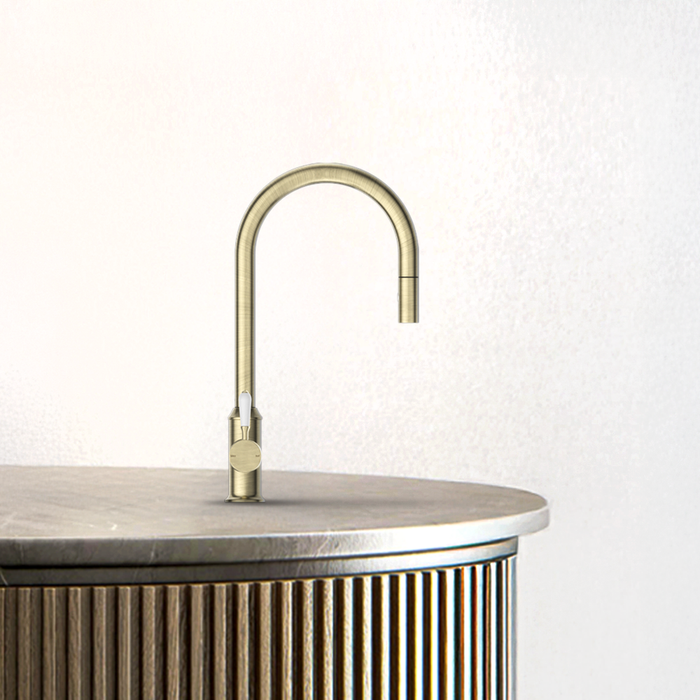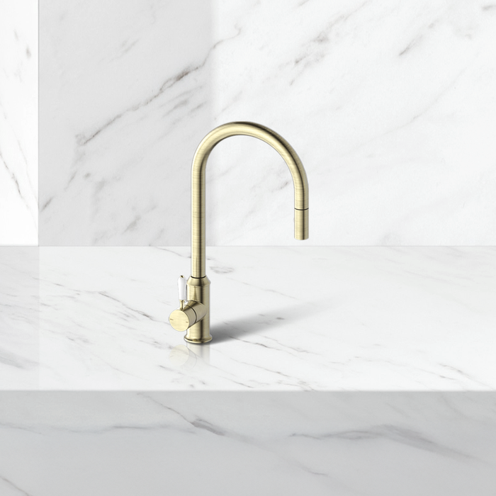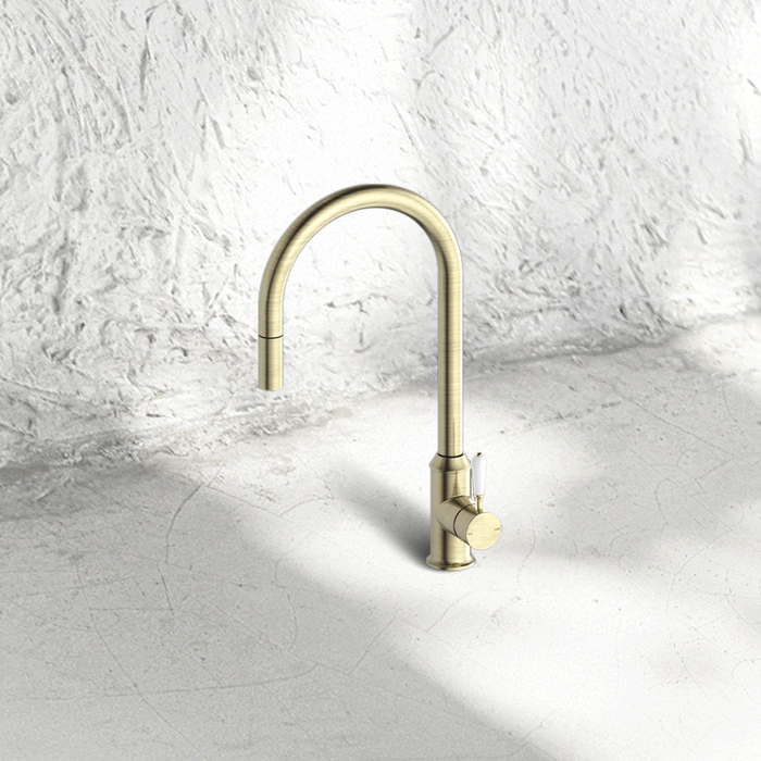 Nero York Pull Out Sink Mixer with Vegie Spray Function with White Porcelain Lever Aged Brass