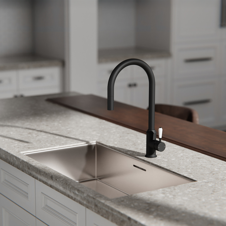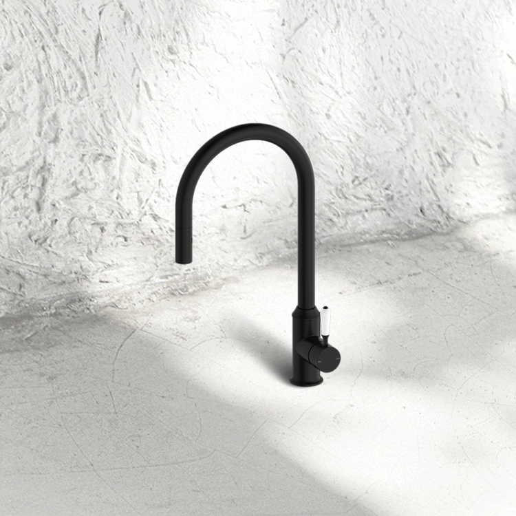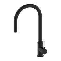 Nero York Pull Out Sink Mixer with Vegie Spray Function with White Porcelain Lever Matte Black