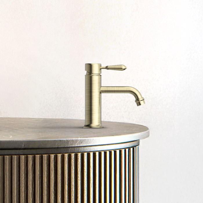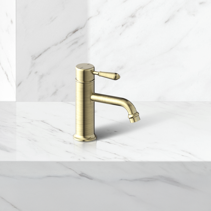 Nero York Straight Basin Mixer With Metal Lever Aged Brass